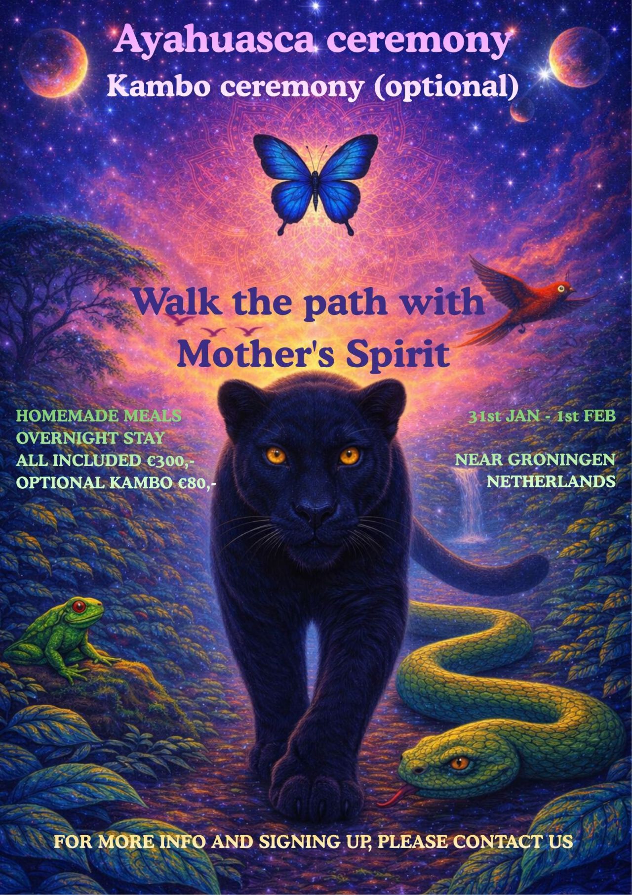 Ayahuasca ceremony with kambo optional. For more information and prices please contact us at +31 6 83582808.